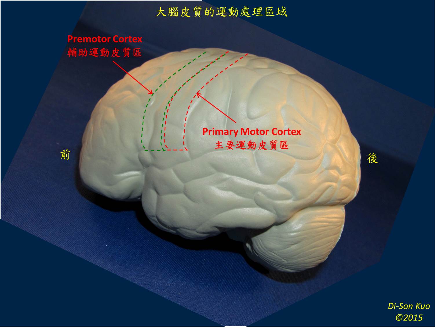在人類大腦的頂部表面、接近前後中點的地方,有一條左右方向的皮質區,是負責全身各部位動作的的最高指揮所,被稱為「 motor cortex 」(運動皮質區)。有趣的是:這個區域不但在演奏音樂時很活躍,連在靜坐的狀況下被動聆聽音樂韻律時,這個區域也很活躍,似乎隨時在躍躍欲動。 在它稍前方的輔助運動皮質區(pre-motor cortex)以及作為運動訊息關卡的小腦(cerebellum),也有類似的反應。 這種連動反應的現象,在最近幾年被醫學界利用來以音樂為巴金森症(Parkinson’s Disease)的患者進行行動復健。